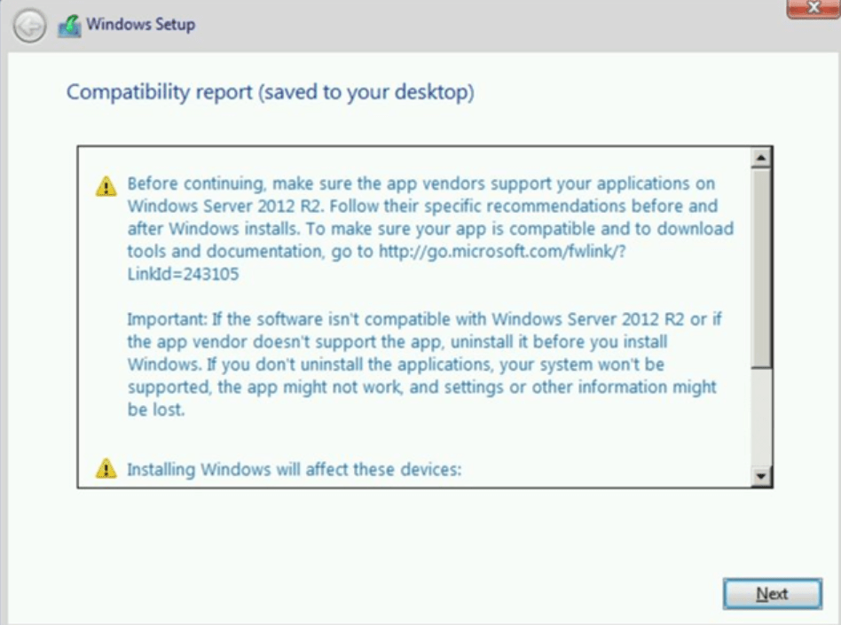Kurulum, uygulama uyumluluğunu kontrol eder ve uyumluluk raporu oluşturur. Bir problem çıkmaz ise next diyerek devam ediyoruz.