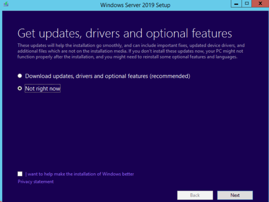 Sunucunuz internete bağlı ise güncellemeleri yüklemek için “Go online to install updates now (recommended)” seçeneği ile ilerleyebilirsiniz. Güncellemeler de yükleneceğinden upgrade işlemi biraz daha uzun sürecektir. Ben “Not right now“ diyerek devam edeceğim.