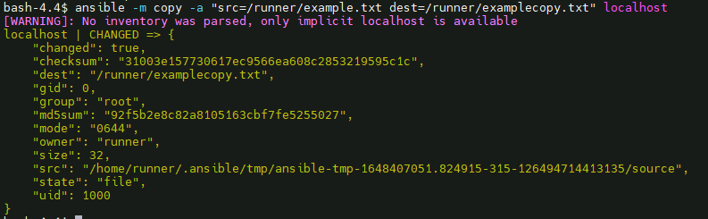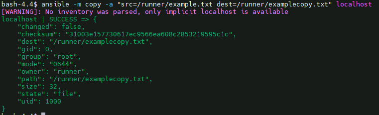 ansible -m copy -a "src=/runner/example.txt dest=/runner/examplecopy.txt" localhost