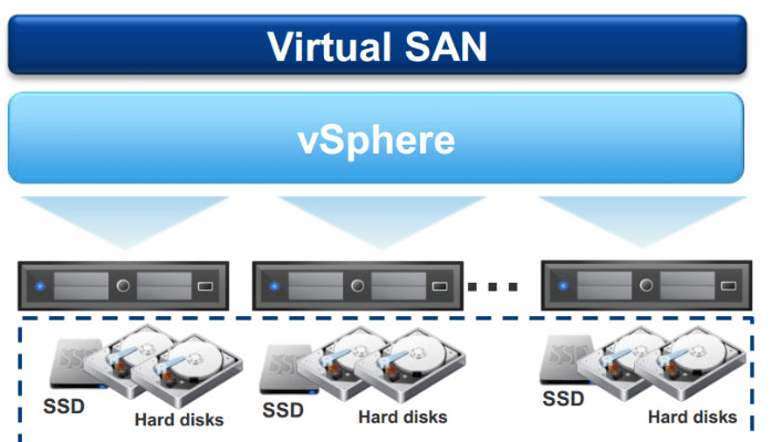 vSAN; Bir donanıma bağımlı olmadan, bir üreticiye bağımlı olmadan elde edilebilecek hem sunucu sanallaştırma hem depolama sanallaştırma mimarisini bize sunuyor. Bunu yaparken de sunucuların yerel disklerini kullanarak ortak bir depolama oluşturuyor.