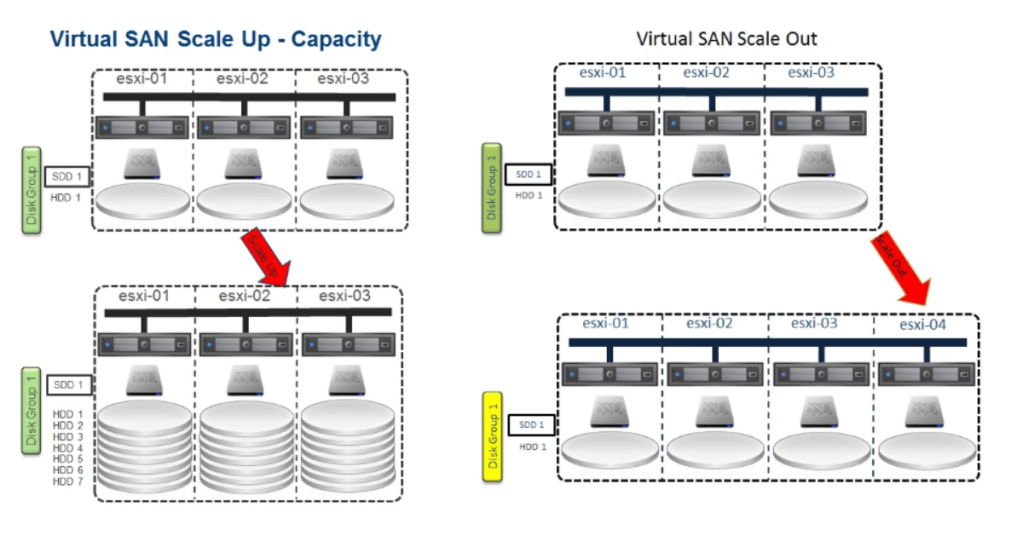 Kapasite ihtiyaçlarımıza göre disk gruplarımızın üzerine disk ilavesi yapabilir ya da disk gruplardan birden fazla oluşturabiliriz. Her bir disk grup içerisinde maksimum 7 tane disk barındırılabilir. Bunun dışında sunucu/host sayısını artırarakta kapasiteyi ve performansı arttırmak mümkündür. İşte burada sıklıkla duyduğumuz scale up , scale out büyüme karşımıza çıkıyor. İlk bahsettiğim disk grupları ile olan büyüme scale up büyümeye örnek iken node ekleyerek büyüme scale out büyümeye örnek olacaktır.