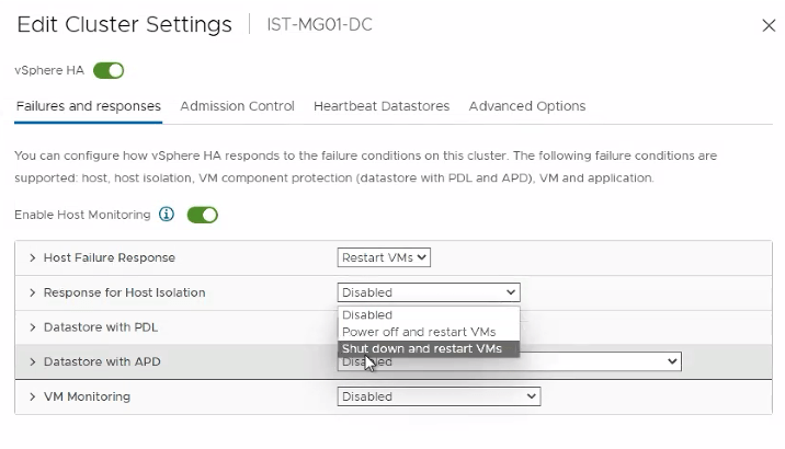 Burada 3 seçenekten birini cevap olarak ayarlamanız mümkündür. Disabled seçerseniz default gatewayine ping atamadın beklemeye devam et demiş olursunuz. Host fail durumda ama üzerindeki vmler çalışmaya devam eder. Power off and restart VMs’i seçerseniz fişini çeker gibi düşünelim, diğeri de makine içinden kapatma talimatı vermektir. İhtiyacınıza göre tercih edebilirsiniz.