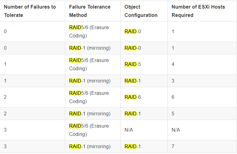 NumberOfFailuresToTolerate = 1 olan bir sanal makineyi deploy ederken 2n+1 kuralına uymalıyız. Yani burada 1 arızayı tolere etmek için 3 ESXi hostumuzun olması gerekecektir. Eğer 3 arızayı tolere etmek istiyorsak 2*3+1=7 ESXi hostuna sahip olmalıyız.
